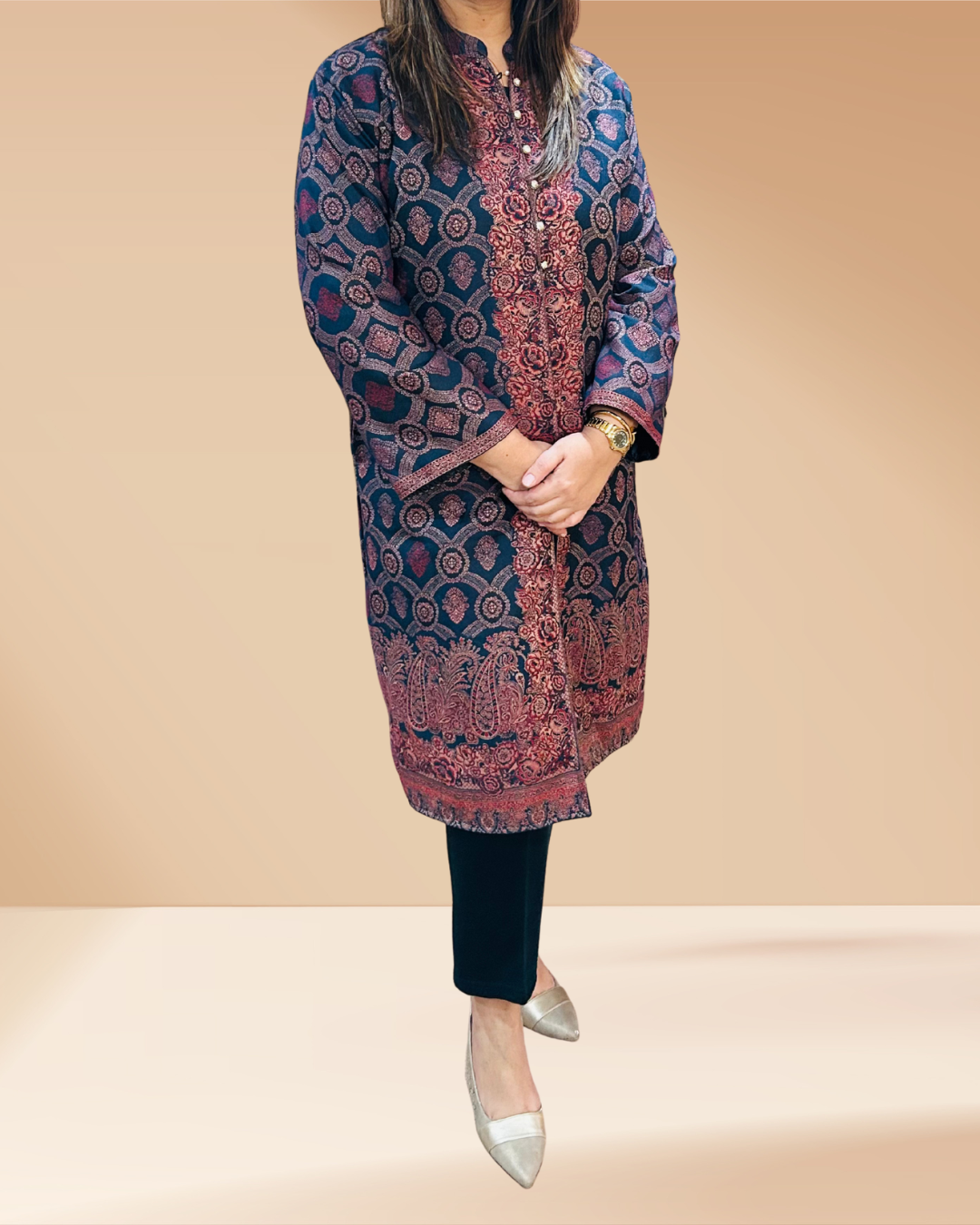Elevate your winter wardrobe with the luxurious Kani Jacket Suit by Label by Sana. This ensemble features a beautifully embroidered Kani jacket, soft Pashmina sleeveless inner for added elegance, and rich woolen pants for ultimate warmth and comfort. Perfect for formal winter gatherings, festive occasions, and elegant soirées, it blends traditional Indian ethnic craftsmanship with modern sophistication. Shop now for timeless South Asian winter festive wear with fast USA shipping!