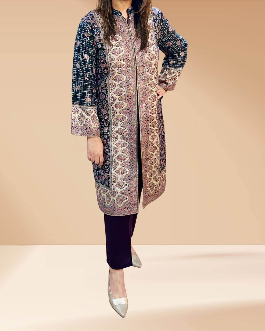 Step into timeless luxury with our Kani Jacket Suit, beautifully paired with a soft Pashmina sleeveless inner and rich woolen pants. Designed for warmth, comfort, and sophistication, this ensemble is a true winter wardrobe essential. Perfect for formal winter gatherings, elegant soirées, and special occasions, it blends traditional craftsmanship with refined modern style. Featuring rich, warm colors and cozy textures showcased through elegant model poses..