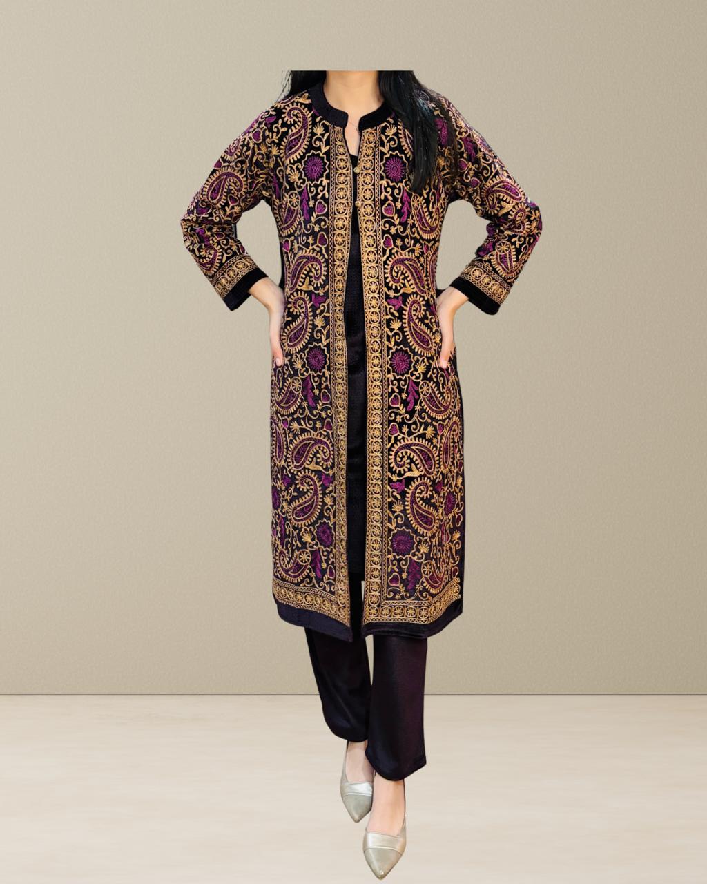 Holiday Glam in Velvet Elegance ✨ Turn heads this festive season with our luxurious 3-piece velvet suit. Featuring a fully embroidered statement jacket, paired beautifully with a sleeveless velvet inner and comfortable velvet pants, this outfit is designed to make you shine at every holiday party. Perfect for winter fashion and evening wear, blending boutique style with ultimate comfort