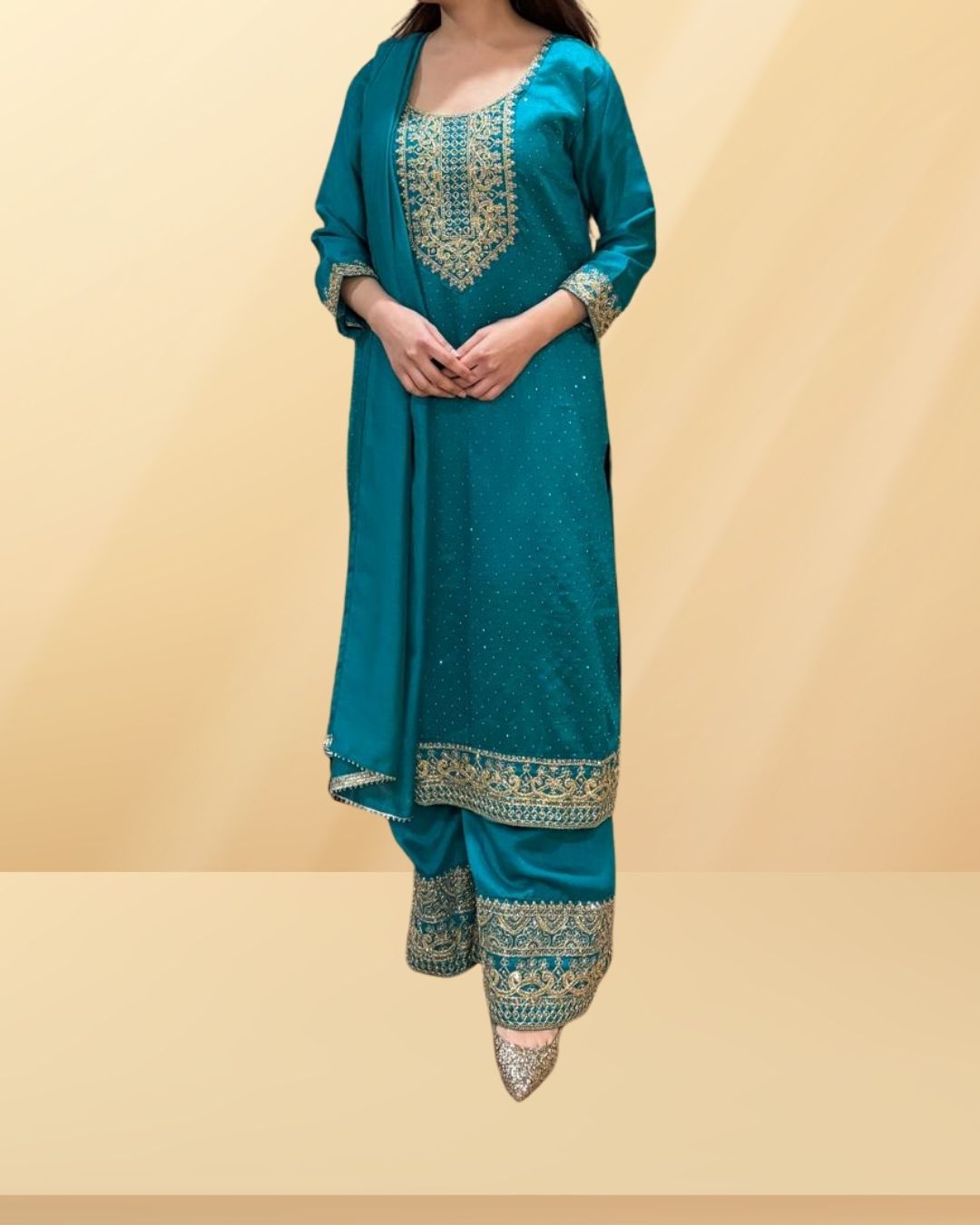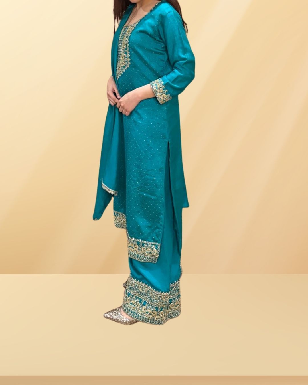 Make a refined statement with this turquoise satin 3-piece suit, designed for effortless elegance and timeless appeal. Crafted from smooth, lustrous satin, the kurta features intricate gold embellishment along the neckline and sleeve borders, adding a subtle yet luxurious glow. Paired with embroidered straight pants and a matching stole, this ensemble offers a polished silhouette that transitions seamlessly from festive gatherings to formal occasions. A graceful choice for those who appreciate classic design with elevated detailing.