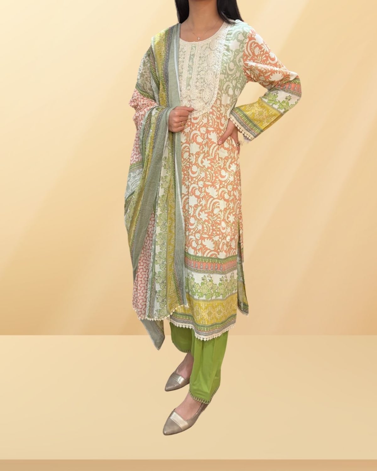 Experience the perfect blend of tradition and comfort with our 3-Piece Multicolor Cotton Suit from Label By Sana. This vibrant Indian Ethnic Suit features a beautiful palette of green, white, and peach, making it a standout choice for the modern Desi woman. The kurta is expertly tailored with intricate white embroidery along the neckline and sleeves, paired with a stunning full-weaving dupatta that adds a touch of regal elegance.