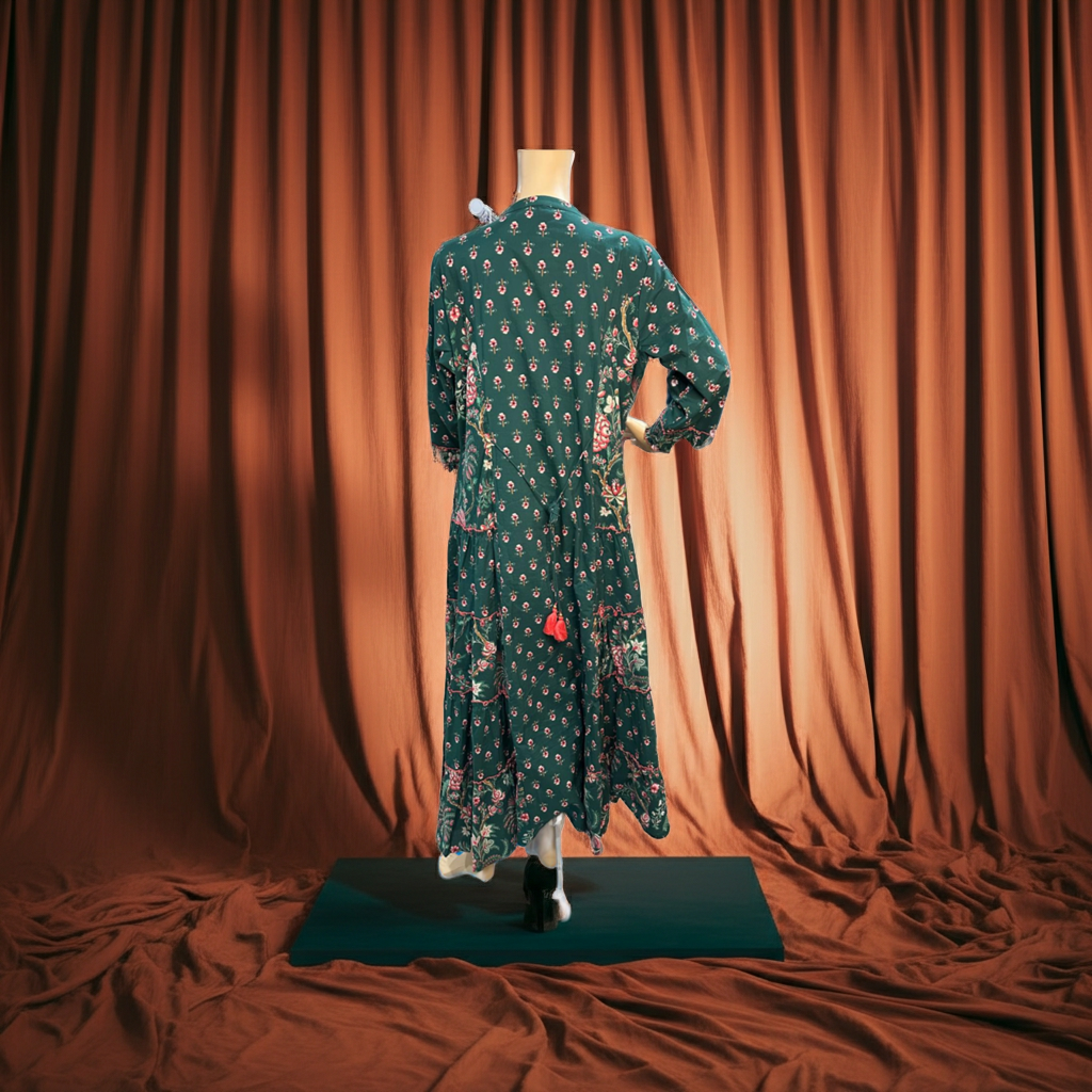 A breeze to wear and beautiful to look at, this 52-inch dark green maxi dress is crafted from soft, breathable cotton. It features a stunning digital floral print in pink and red tones, accented with a tiered skirt design and a stylish tassel tie-up at the waist.