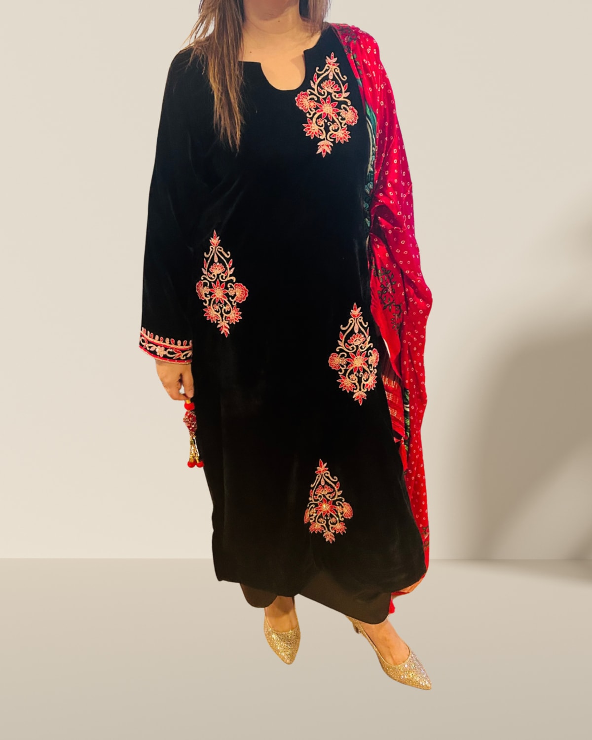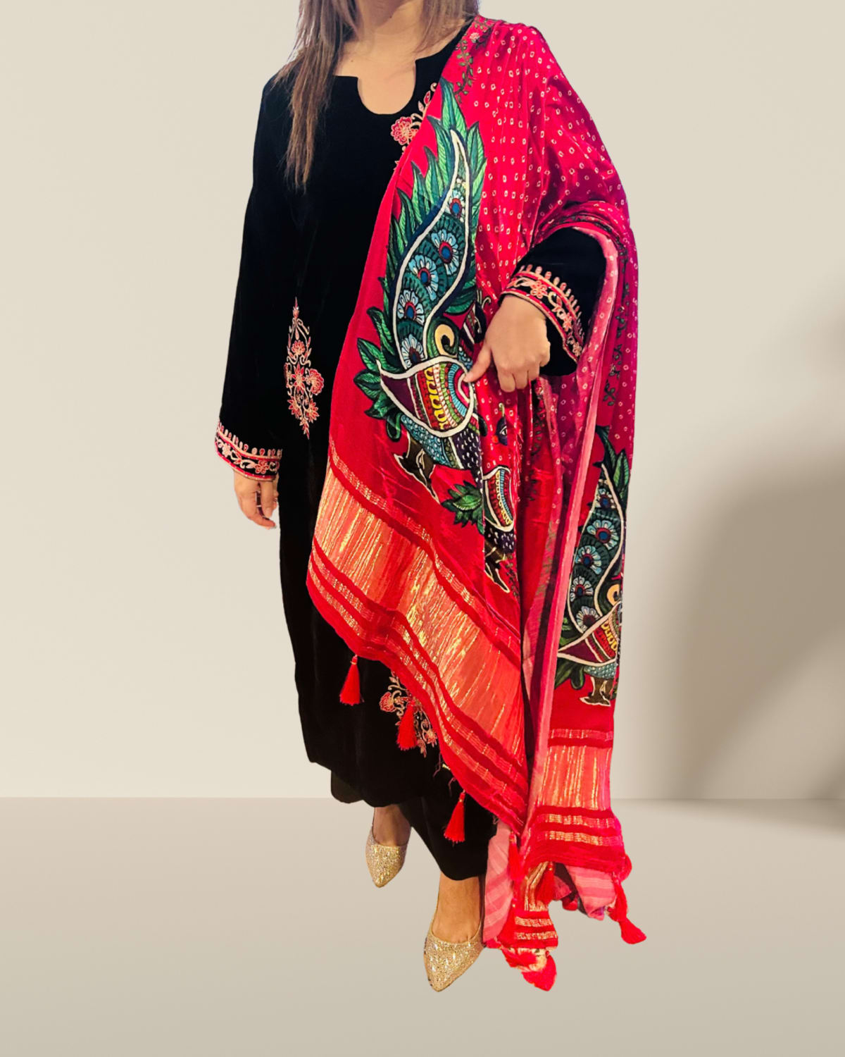 ✨Luxurious Set: Includes a velvet kurta, luxurious satin silk pants, and a full-size Bandhani silk chador dupatta featuring traditional peacock motifs.