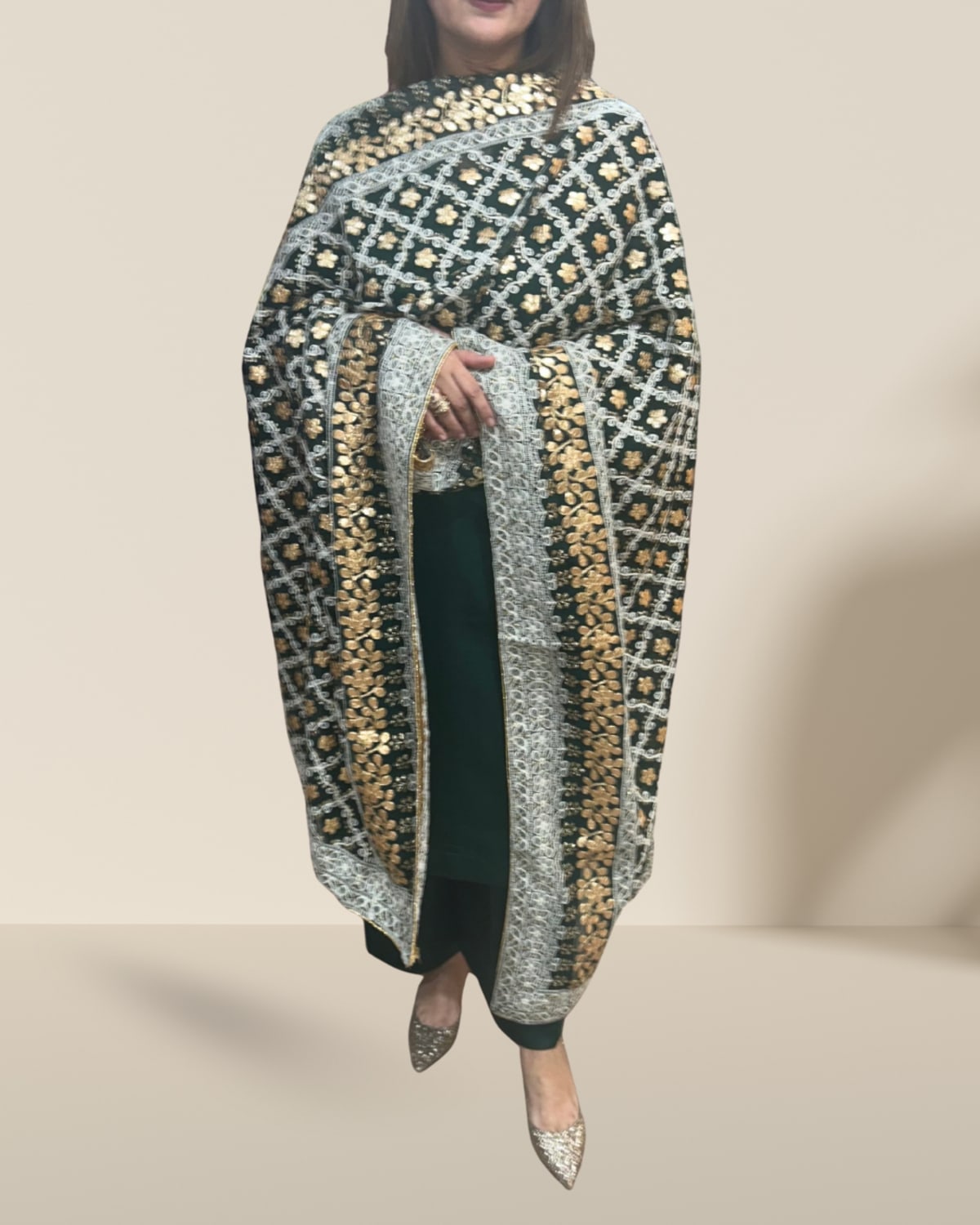 This deep green satin silk suit is elevated with a statement embroidered dupatta. Intricate gold detailing and a finely finished border lend a regal charm, making this ensemble ideal for weddings, festive events, and elegant cultural occasions.