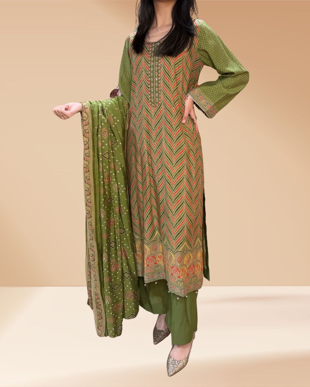 Experience the essence of South Asian luxury with our Fully Embroidered Green 3-Piece Suit from Label By Sana. This exquisite Indian Ethnic Wear ensemble is meticulously tailored and ready-to-wear, featuring intricate thread-work embroidery along the elegant neckline. The sleeves and daman (hem) are finished with delicate pearl detailing, offering a refined, boutique-quality finish.