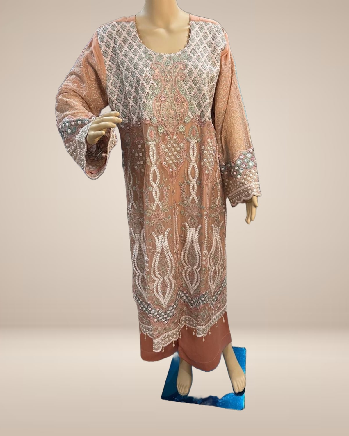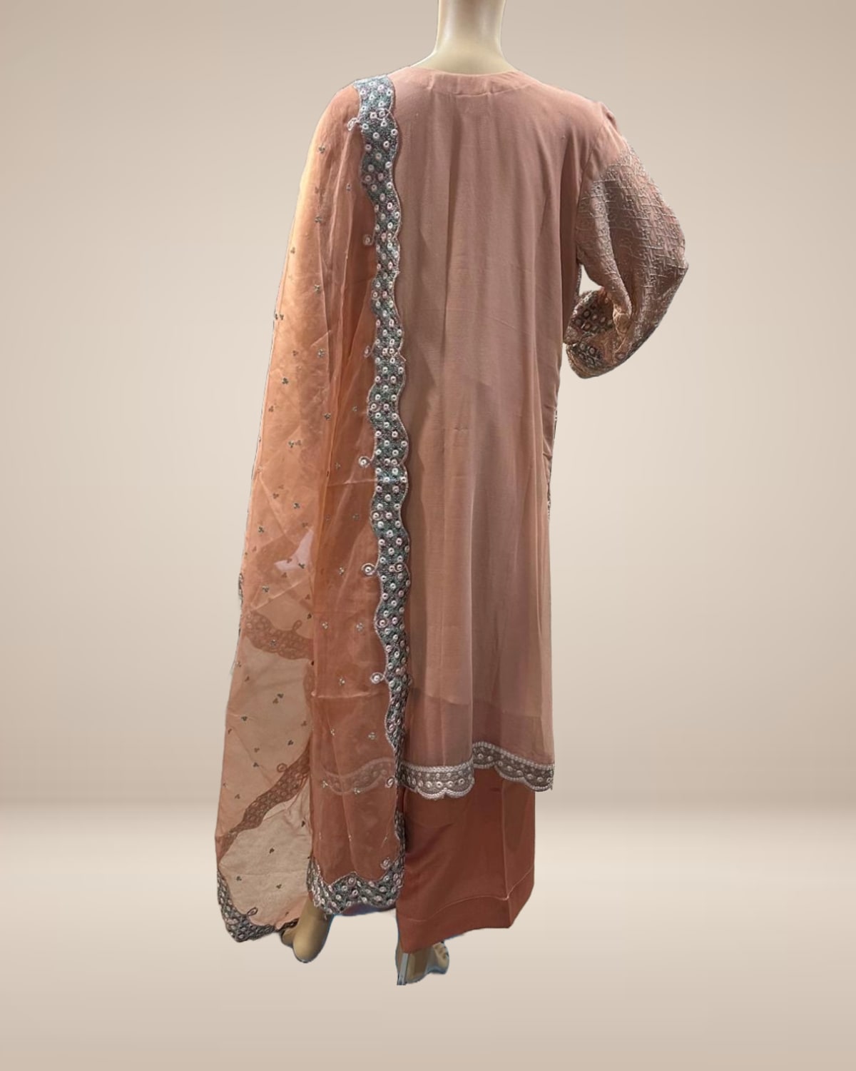 A gorgeous peach chiffon suit designed with intricate all-over embroidery for a refined, graceful look. This elegant set is paired with a beautifully coordinated chiffon dupatta and smooth satin pants, offering a perfect balance of luxury and comfort. Ideal for festive occasions, intimate celebrations, and evening gatherings.