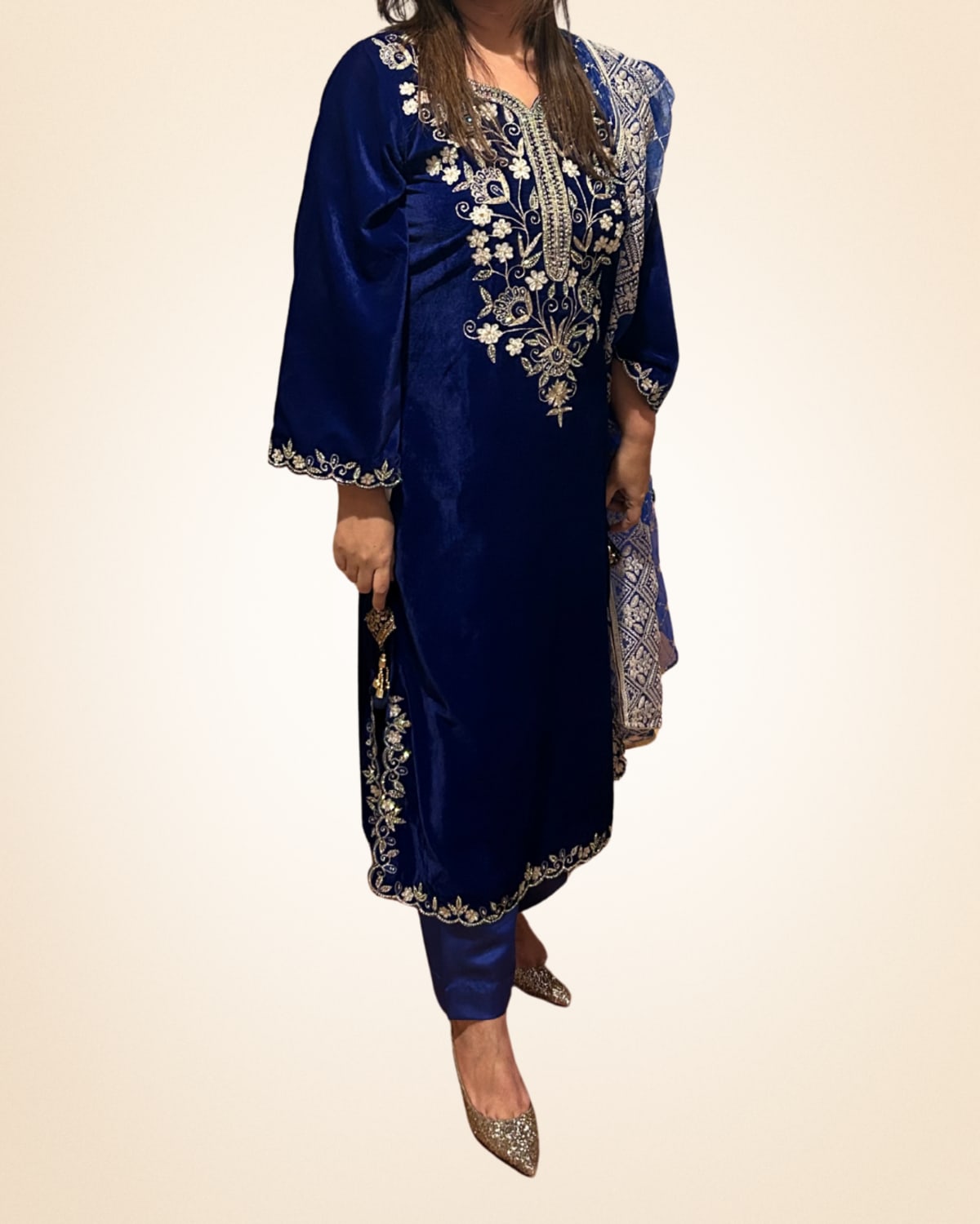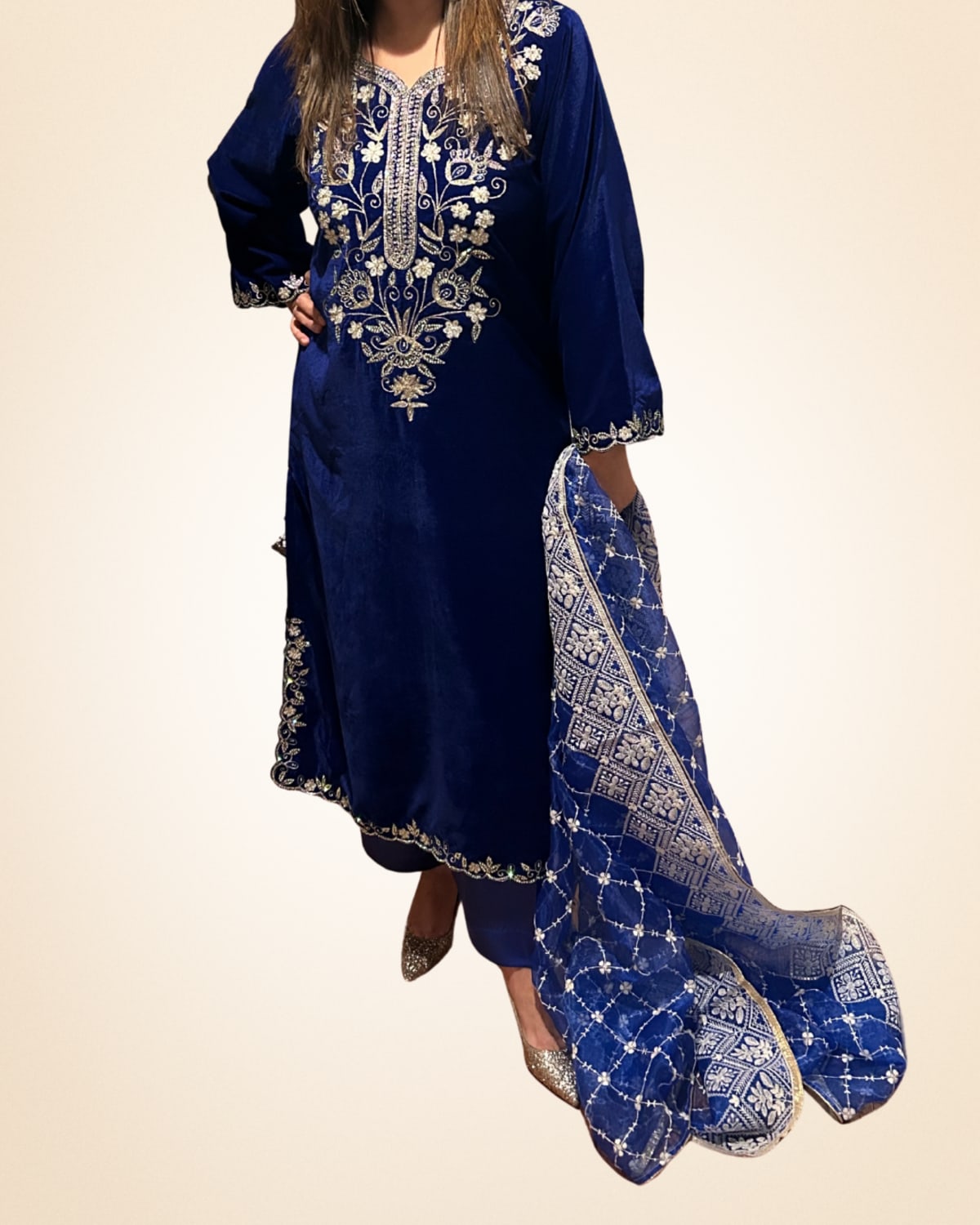 Step into timeless winter elegance with this navy blue velvet 3-piece suit, designed to make a statement with understated luxury. Crafted from rich, plush velvet, the kurta is adorned with intricate silver embroidery along the neckline and sleeves, creating a beautifully refined look. Paired with matching trousers and a patterned dupatta, this ensemble offers a graceful silhouette perfect for formal gatherings, festive celebrations, and winter weddings. A classic choice for those who appreciate traditional craftsmanship blended with contemporary sophistication.