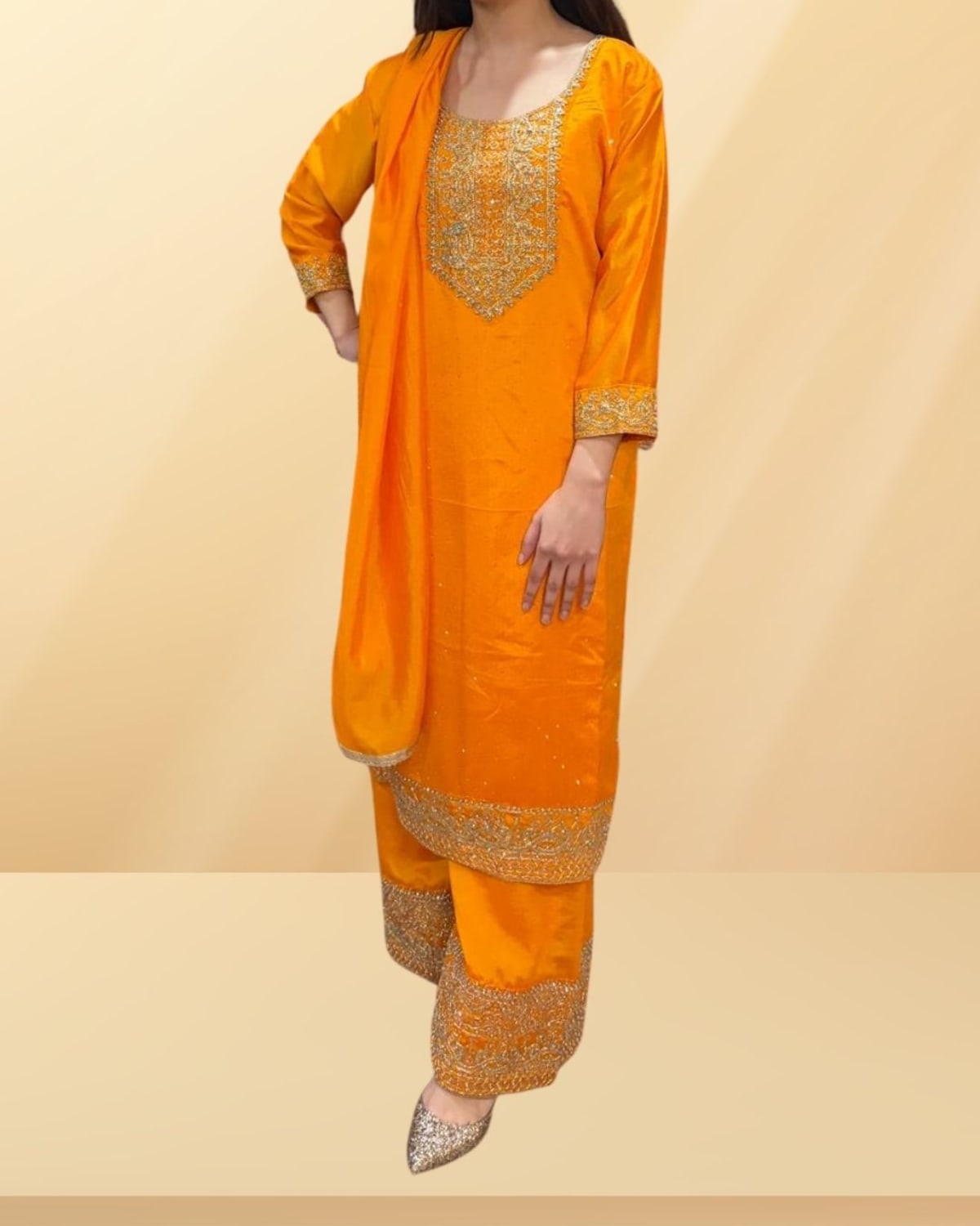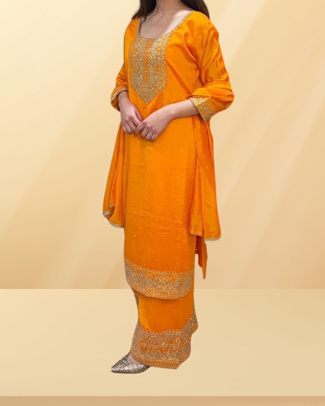 Stand out this season in our Orange Satin-Silk 3-Piece Suit, a vibrant celebration of Indian ethnic fashion. Curated by Label By Sana, this striking ensemble features a rich orange silk kurta elevated with handcrafted gold embroidery along the borders. The set includes coordinating embroidered trousers and a matching stole, creating a complete, polished look that turns heads.