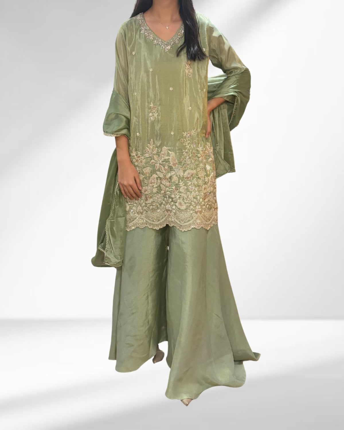 The kurta features intricately hand-embroidered pearl and nalki work throughout with a refined V-neckline and heavily embroidered borders. Soft, silky crepe fabric drapes gracefully while 3/4 sleeves add sophistication. Paired with wide-leg tissue shimmer sharara pants for fluid movement and a chiffon dupatta finished with delicate four-side lacing. Fully lined for comfort.