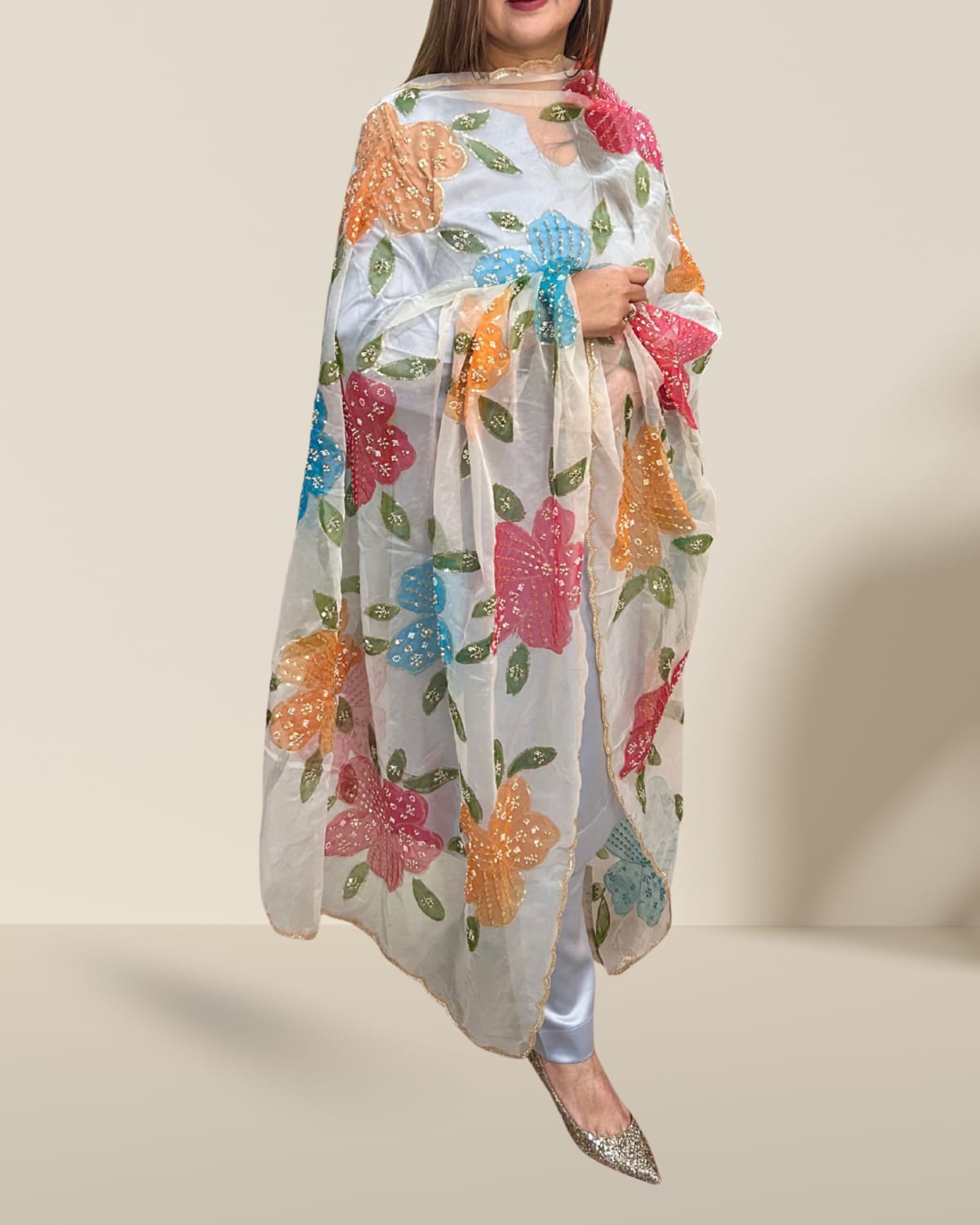A celebration of craftsmanship and color, this powder blue satin silk kurta set is elevated by a stunning hand-painted organza dupatta. The clean, minimalist kurta allows the vibrant floral artwork to take center stage, making this a sophisticated choice for those who appreciate refined design with an artistic touch.