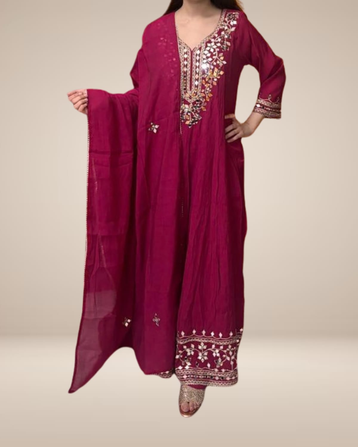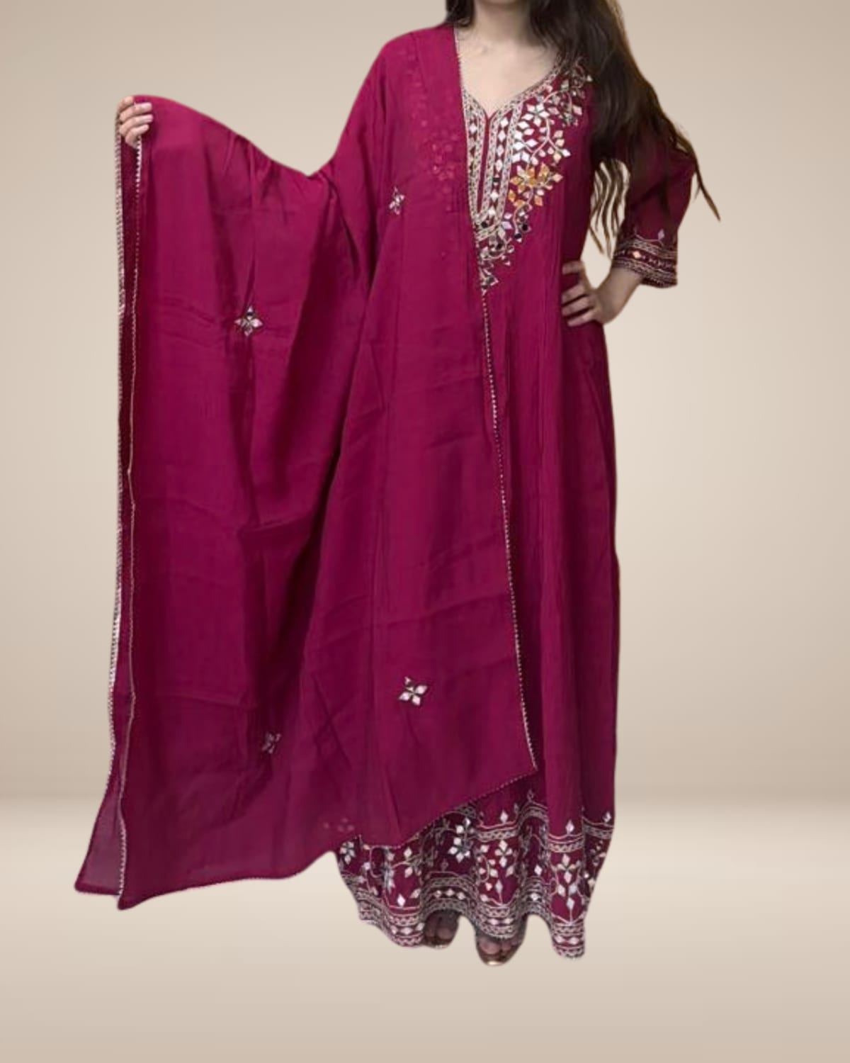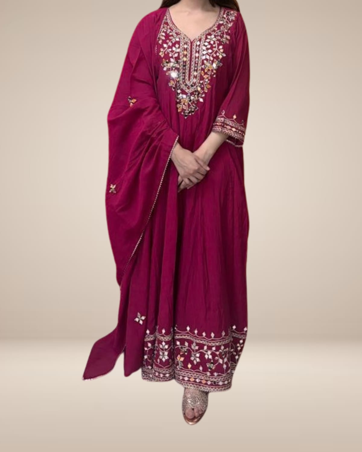 Elegant rani pink Anarkali dress crafted in mul cotton with mirror work embroidery. A graceful floor-length festive outfit perfect for Eid, weddings, and celebrations.