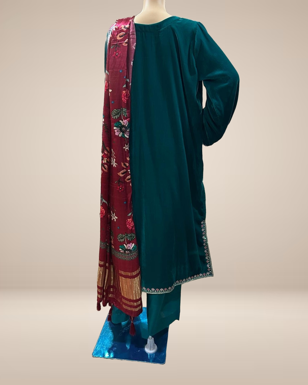 Make a statement in this elegant turquoise velvet 3-piece suit, crafted for timeless festive glamour. The kurta features intricate embroidery along the neckline and borders, beautifully complemented by a rich silk dupatta with traditional motifs and gold accents. Paired with comfortable coordinating bottoms, this ensemble is perfect for weddings, formal gatherings, and evening celebrations where luxury meets tradition.