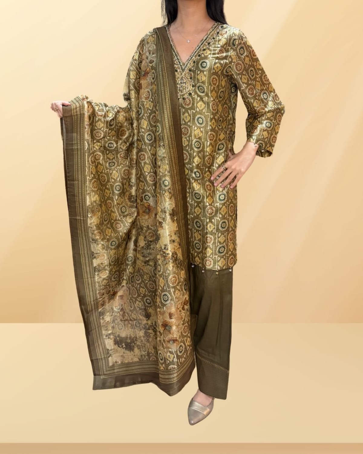 Step into regal elegance with our Tussar Silk Farshi Shalwar Set—a luxurious ensemble designed for timeless, effortless sophistication.